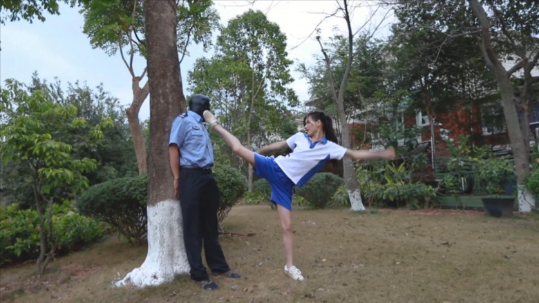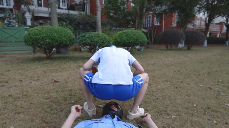 【内容简介】:芷晴扮演的学生小太妹,在校园抽烟,被保安看到了说了一顿。怎料保安碰到了个硬茬。放学后小太妹把保安喊道了公园里,拳脚相向,飞踹、暴踢,还有坐脸、腿绞。这次保安是彻彻底底被制服了。