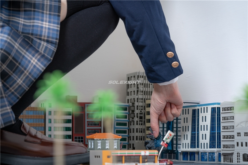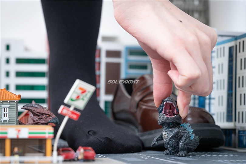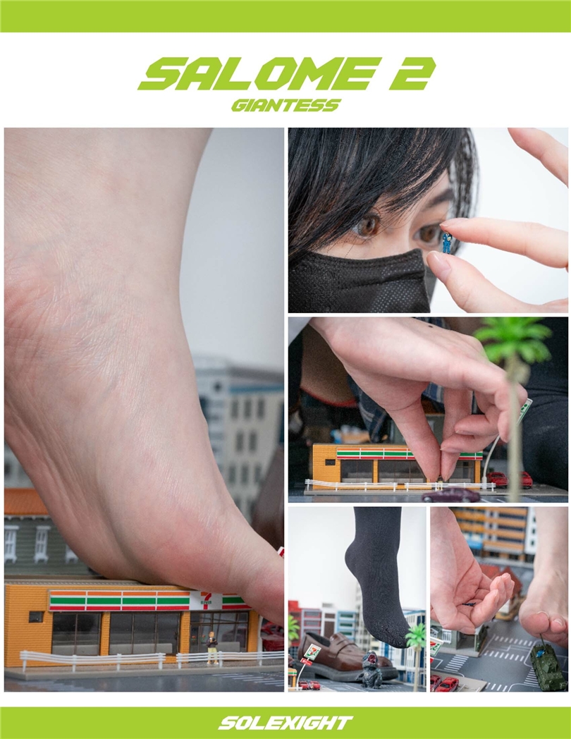 作品說明:某天哥吉拉及怪物們入侵了人類的城市...聽到人們的呼救聲...原本正在上學途中的Salome突然展現了她隱藏的身分,她是一名可以自由巨大化的的魔女。巨大化之後的Salome,身高395公尺,在她腳邊的怪物不過15公尺的高度,緩緩走向怪物後舉起了她的腳,並用腳威脅著牠們,捏起了腳邊的哥吉拉之後從牠口中的市民將解救出來,原本嚇到腿軟的民眾被Salome兩根超巨大手指捏了起來,在她眼中,一般的人類不過只有不到一公分的高度。最後Salome將哥吉拉放進自己的學生皮鞋中,但卻脫下了襪子開始踩踏人類的建築物...?軍方派出了一台戰車試圖想要攻擊眼前這個超巨大的她,可是人類的戰車卻只有跟她腳的大拇指一樣大,Salome似乎有點不悅...便用腳趾將戰車夾了起來...然後將指揮戰車的軍官捏了起來握在手中...到底會怎麼樣呢?